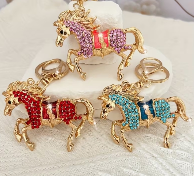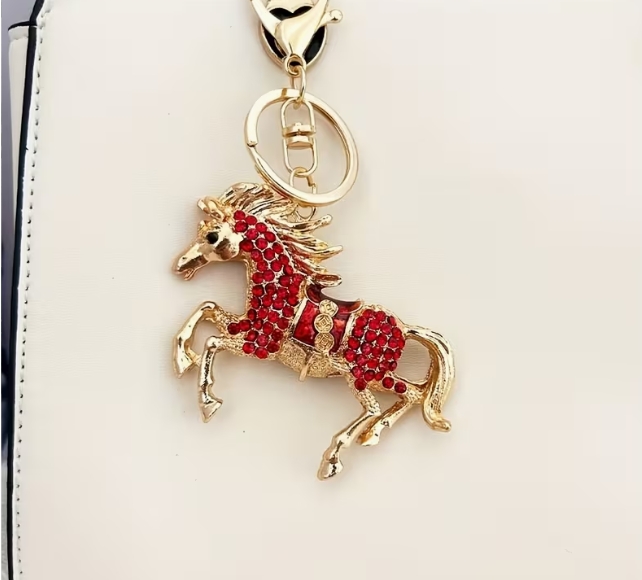 Elegantiškas raktų pakabukas su žėrinčiais kalnų krištolais - cinko lydinys, omaro užsegimas, idealiai tinka moteriškiems rankinėms ir krepšiams, universalus aksesuaras, puiki Kalėdinė dovana, raktų pakabukas su ugniniu arkliu.