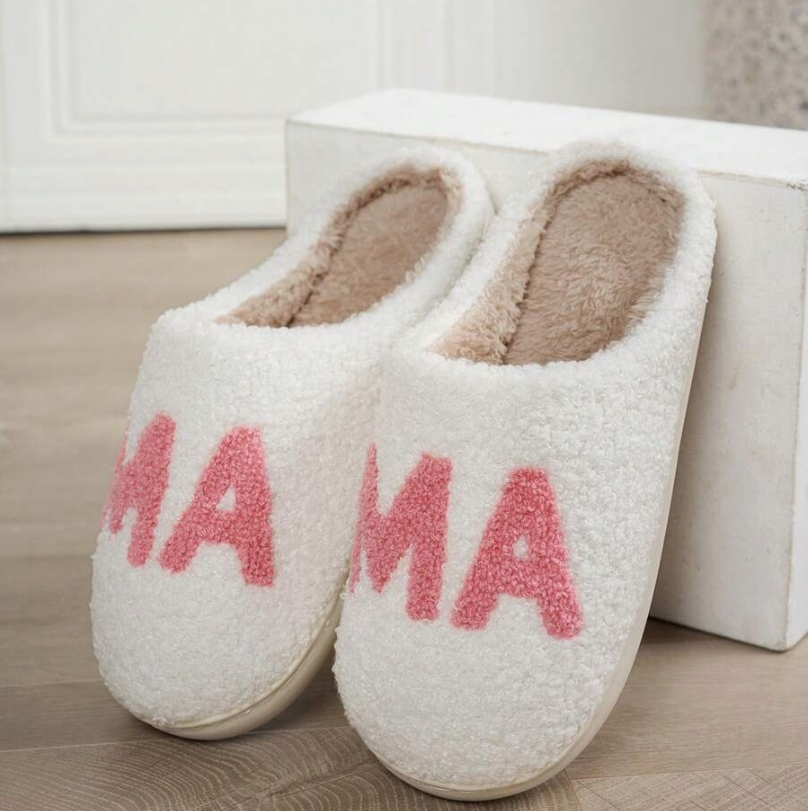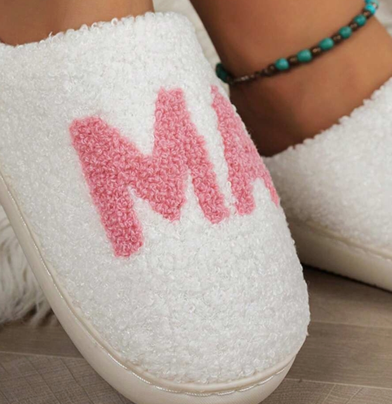 Minkštutės, šiltutės, baltutės moteriškos šlepetės su dailiu rožiniu žodžiu MAMA.